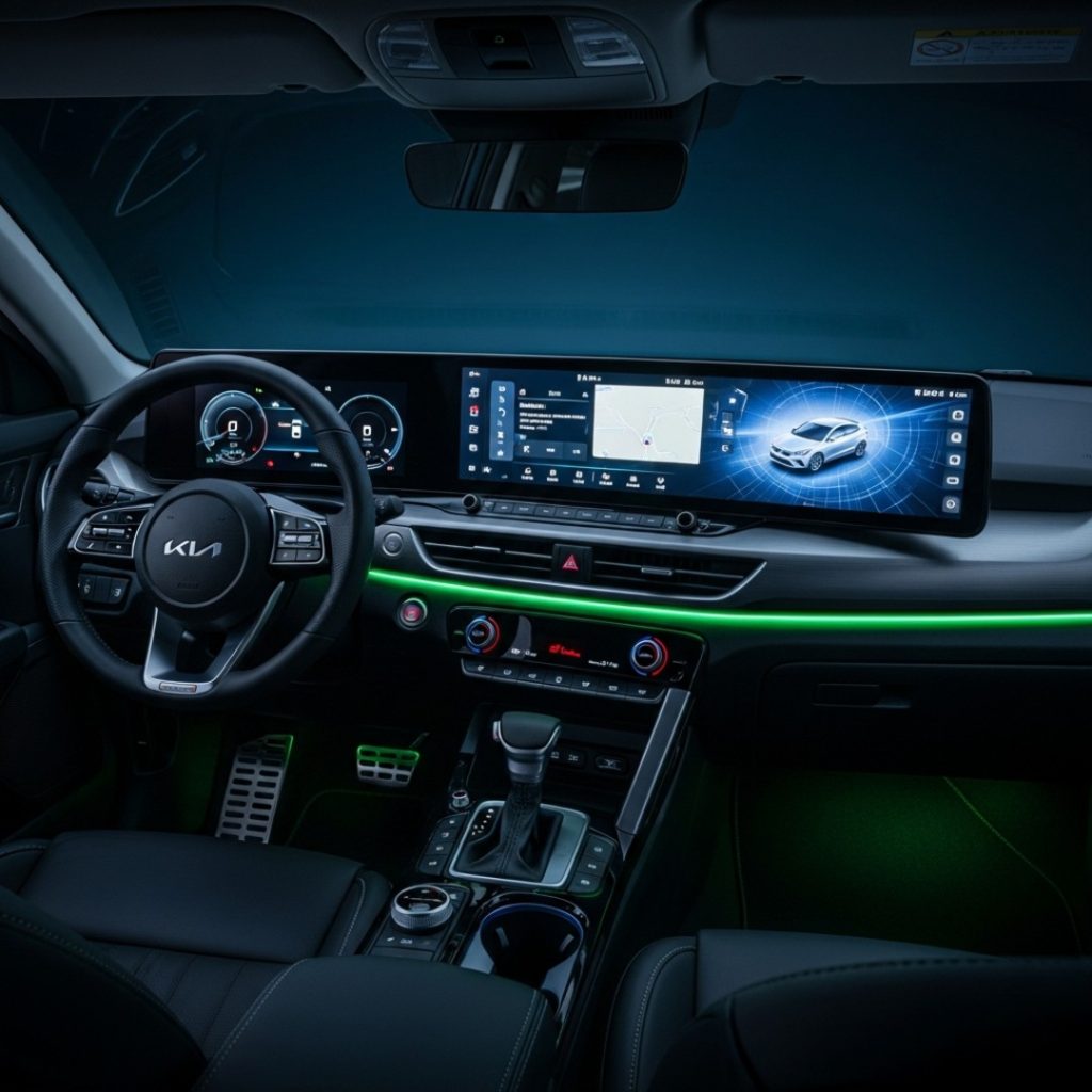 - Dashboard: It’s a mix of soft-touch leatherette and high-quality plastics. The new three-spoke steering wheel (borrowed from the EV6) feels chunky and premium.